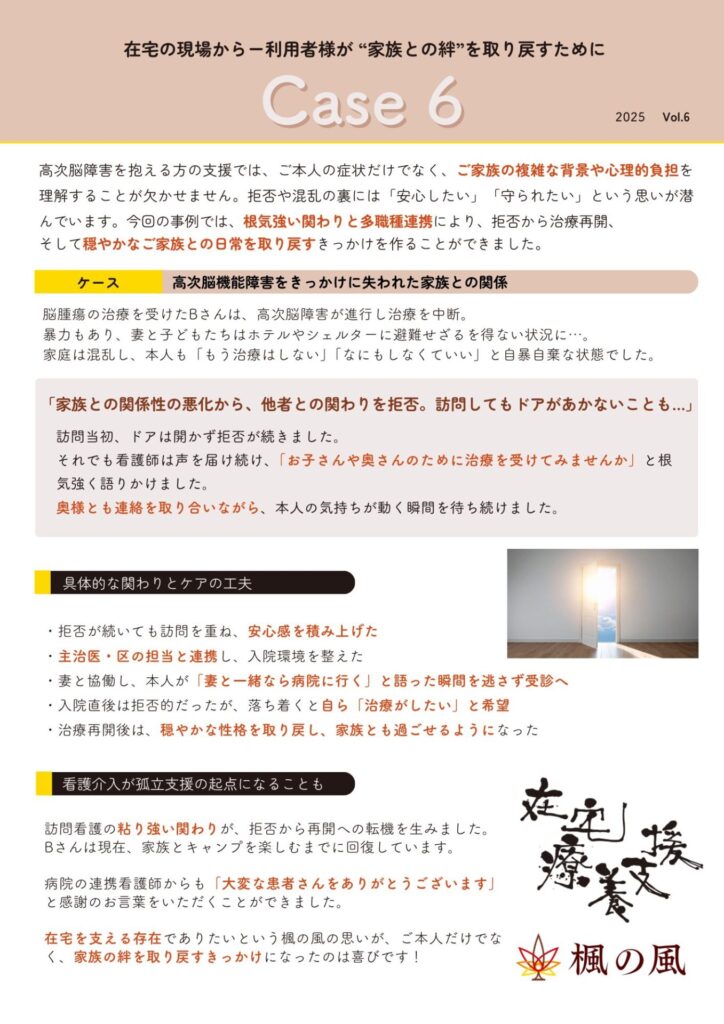 ケース概要 ✤ 高次脳障害を抱える方の支援では、ご本人の症状だけでなく、ご家族の複雑な背景や心理的負担を理解することが欠かせません。拒否や混乱の裏には「安心したい」「守られたい」という思いが潜んでいます。今回の事例では、根気強い関わりと多職種連携により、拒否から治療再開、そして穏やかなご家族との日常を取り戻すきっかけを作ることができました。 case6ダウンロード TOP > Kaede Times|楓の風の看護実践 > Case 6|再び家族との絆を取り戻すために