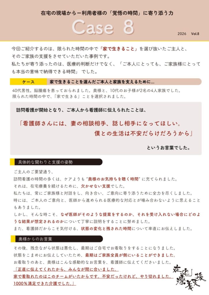 ✤ 今回ご紹介するのは、限られた時間の中で「家で生きること」を選び抜いたご主人と、そのご家族の支援をさせていただいた事例です。私たちが寄り添ったのは、医療的判断だけでなく、「ご本人にとっても、ご家族様にとっても本当の意味で納得できる時間」 でした。特に、奥様とのコミュニケーションを密に重ね、対話を通じて信頼関係を築いたことが、悔いの残らないお看取りにつながりました。